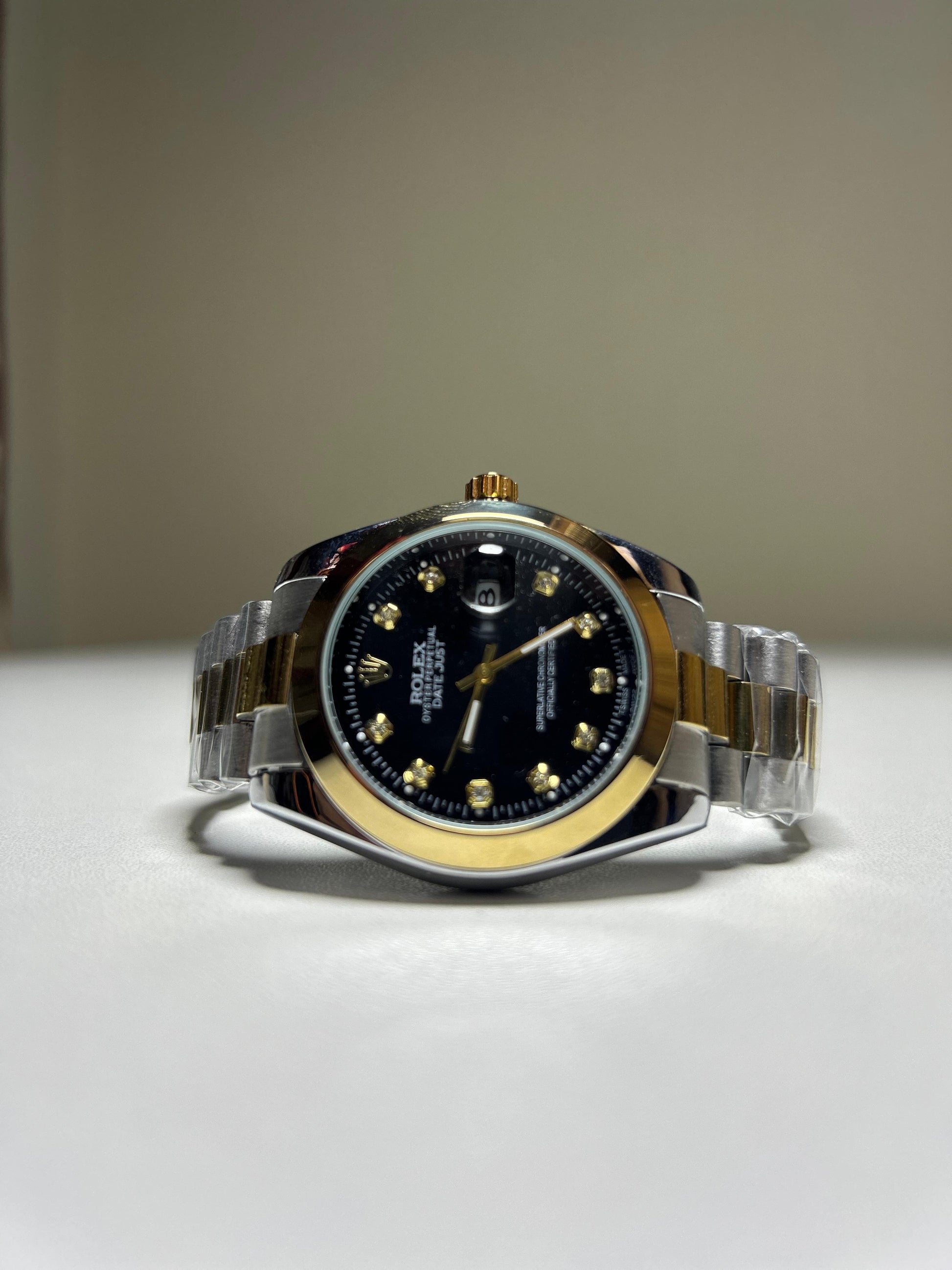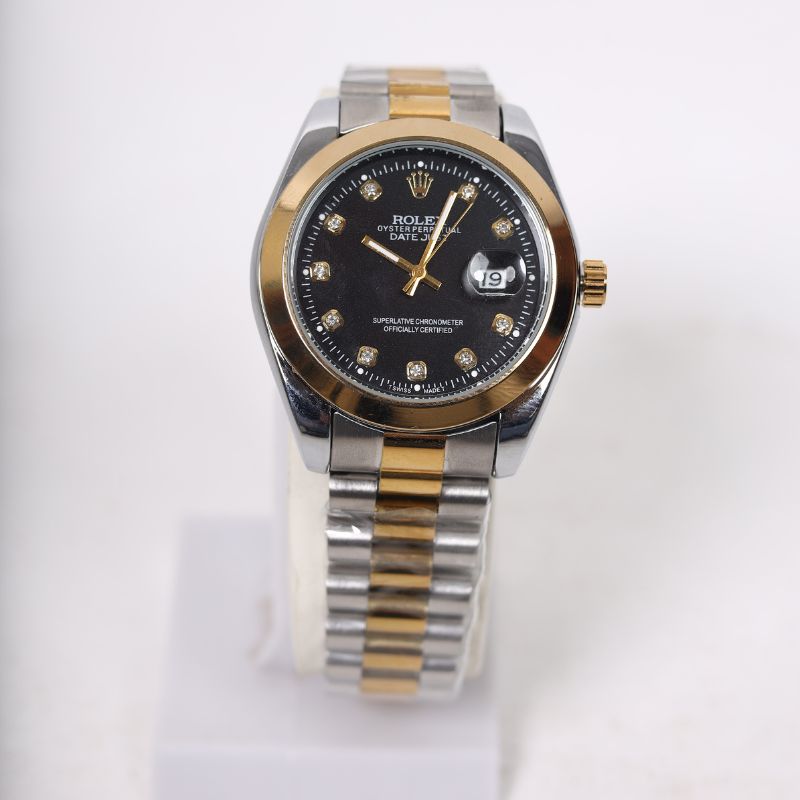 The Rolex Oyster Perpetual is the symbol of timeless elegance & superior craftsmanship. Featuring a two-tone silver & gold bracelet, a black dial with diamond markers 💎, and the iconic Oyster case, this masterpiece delivers both luxury & reliability.